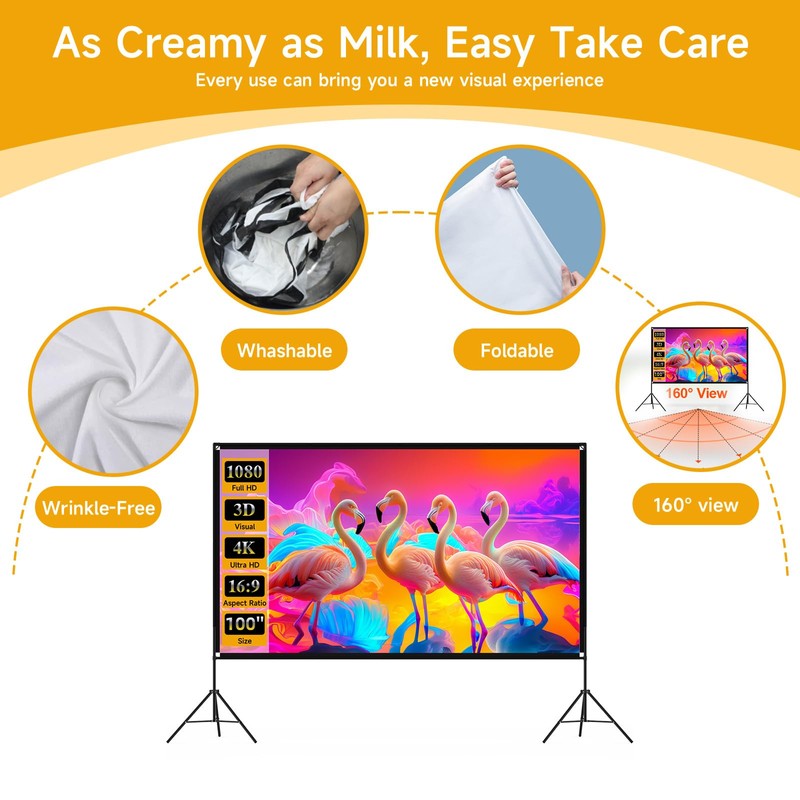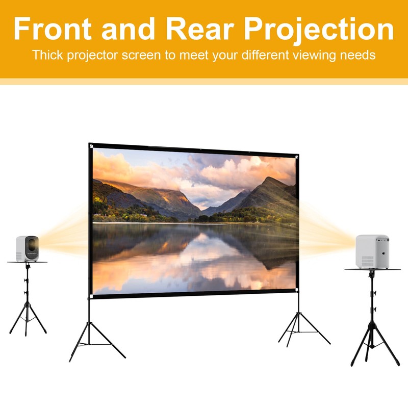 - 1.5 Gain, 160°Wide Viewing Angle: 100 inch projector screen is made of polyester milk silk material, thicker than ordinary projector screens, bringing 1.5 gain, immersive experience of clear and bright visual effects, while ordinary only 1.0 gain. 160°wide viewing angle and double-sided projection allow you to enjoy outdoor movie night from any angle.
