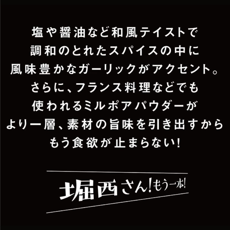• 塩や醤油など和風テイストで調和のとれたスパイスの中に風味豊かなガーリックがアクセント
