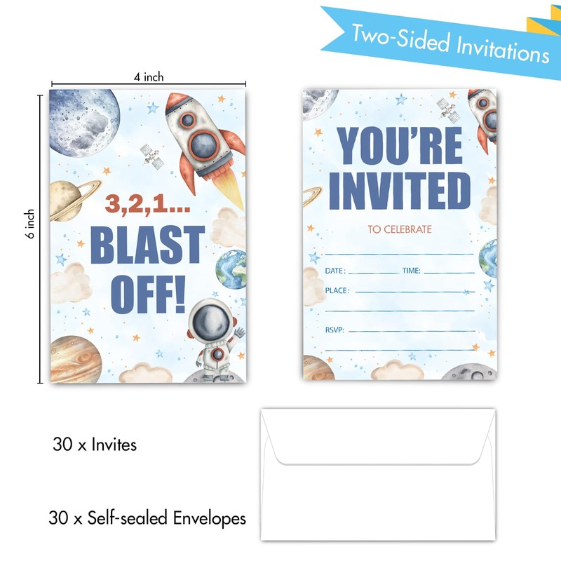 - 30Pcs Birthday Invitation Cards Set: Each watercolor spaceship themed party invite card comes with a self-adhesive envelope, which is ready for sending to your party guests.
