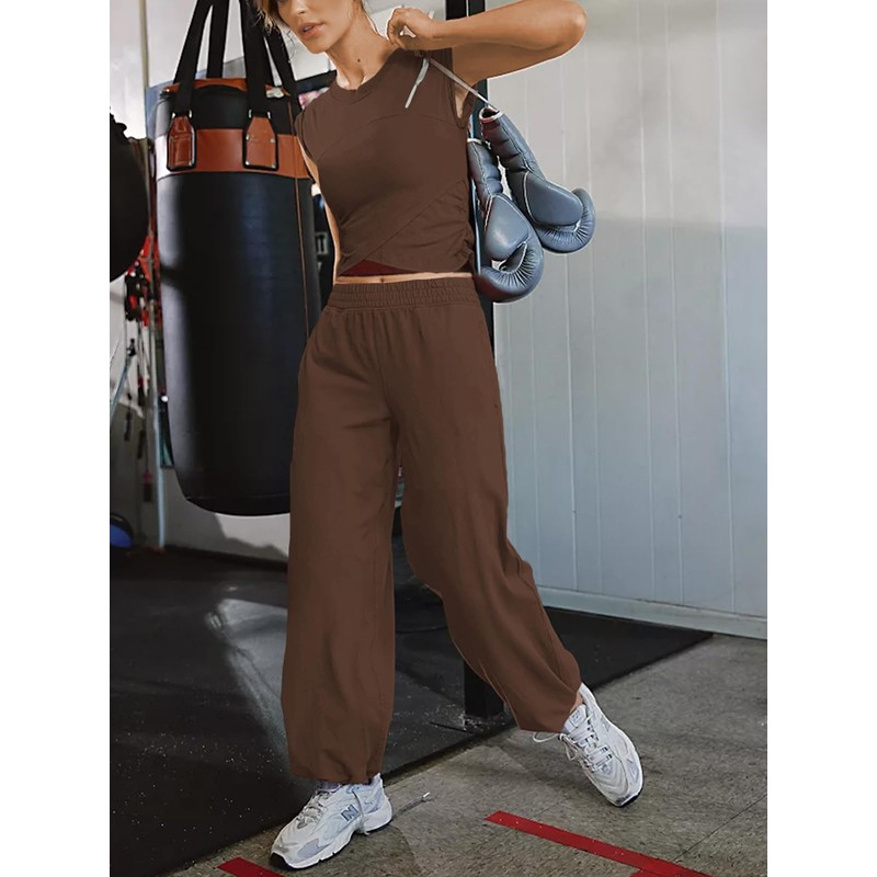 Outfeel Women 2 Piece Outfit Set Loungewear Cropped Tops and Jogger Sweatpant Matching Set Coordinated Sweatsuit with Pockets Coffee Small