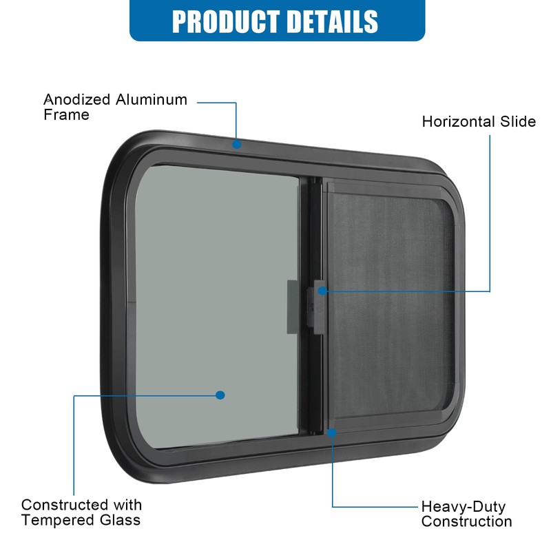 • DURABILITY: The horizontal RV window features anodized aluminum framing that prevents corrosion and significantly extends its lifespan. The included black trim ring ensures a tidy and swift installation process while enhancing stability and reducing aerodynamic drag for optimal performance