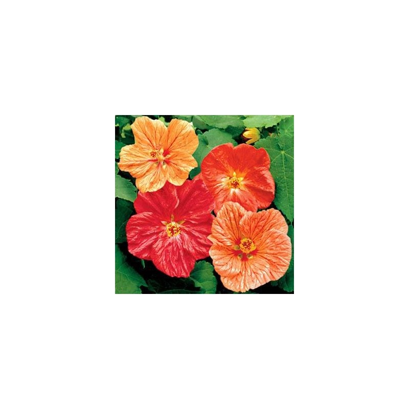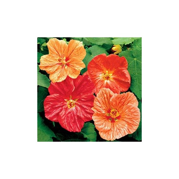 Abutilon (Abutilon Hybridum Bellvue Mix) - This lovely Flowering Maple has early blooms and vivid colors! Abutilon blooms, when full-sized, will stand out from across the garden! This flowering maple plant will provide brilliant shades of red, orange and yellow from spring until frost. You just can't find an easier, more beautiful source of color indoors or out which can be grown from flower seeds! The flowers are 3 inches across and have a crepe-paper feel, somewhat like Hibiscus. You won't believe how many flowers you get on each and every plant grown from Abutilon seeds.