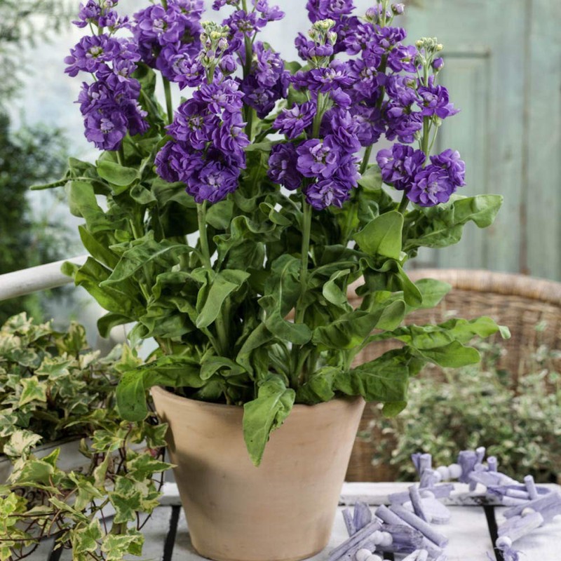 Matthiola incana is a wonderful flower that provides brilliant colors, a spicy fragrance and a nectar source for butterflies. It is commonly referred to as Stock or Hoary Stock, and this variety is called Ten Week Stock. It is grown as an annual in most zones, but in frost-free zones, it will remain as a perennial. Stock likes a position in full sun, and it prefers gritty, fast- draining soils. This variety has sturdy stems that are full of tightly clustered blue colored blooms. Stock makes an excellent cut flower with a long vase life. They grow best in areas with cool summers, like coastal areas. For the hot southern climates, grow Stock in the fall for lovely color in the fall and early winter. Start the seed indoors 6- 8 weeks before setting out. Press the seed into the soil and cover with 1/8 inch of soil. This seed needs light and continuous moisture for proper germination. With a temperature of 70F, germination is usually within 28 days. Transplant into the garden and space the plants 14 inches apart.