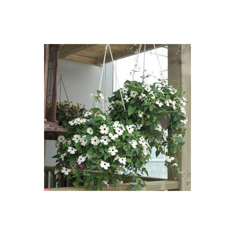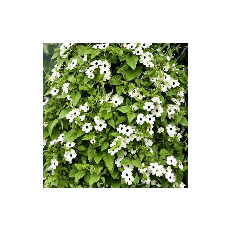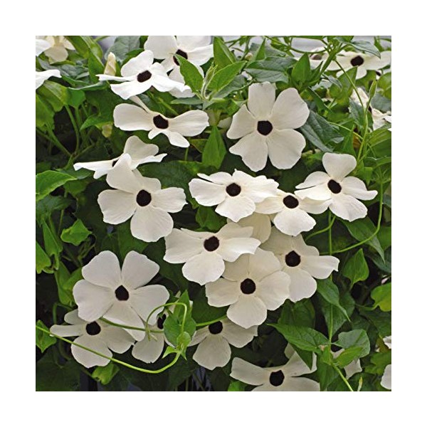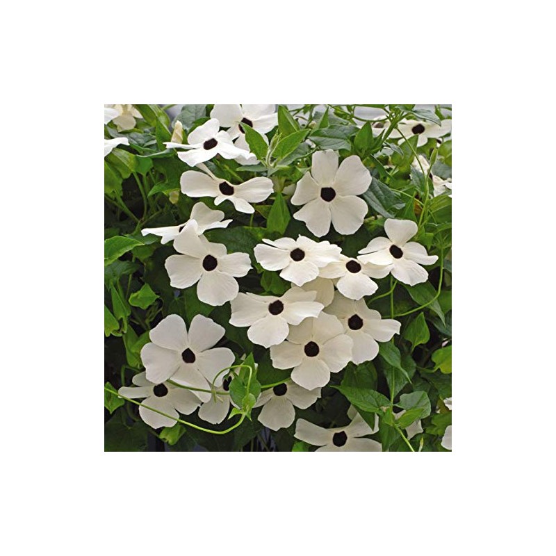 Thunbergia Alata (Sunrise White) - Expect this Black-eyed Susan vine to reach 5 to 8 feet tall. Thunbergia Alata White is one of newest members of the Black-Eyed Susan family. Grow this wonderful new variety in containers, baskets, trellis, gateways, etc. or simply dress up your flower garden with this easy to plant flower seed. Let it race up a trellis, festoon the mailbox or pillar, or show off against a wall or fence. Thunbergia White Black-eyed Susan Vine is very quick to bloom, offers a super-long season of color, and has a classic color pattern that complements everything in the garden! The blooms are a good size normally reaching about 1 1/2 inches in diameter when open wide. The petals are white, surrounding a bold black eye on most blooms. The blooms are profuse smothering 5 to 8 foot vine over a long bloom season clear up until frost. You will have this wonderful blooming vine in full display 6 months out of the year with this easy to grow flower seed.