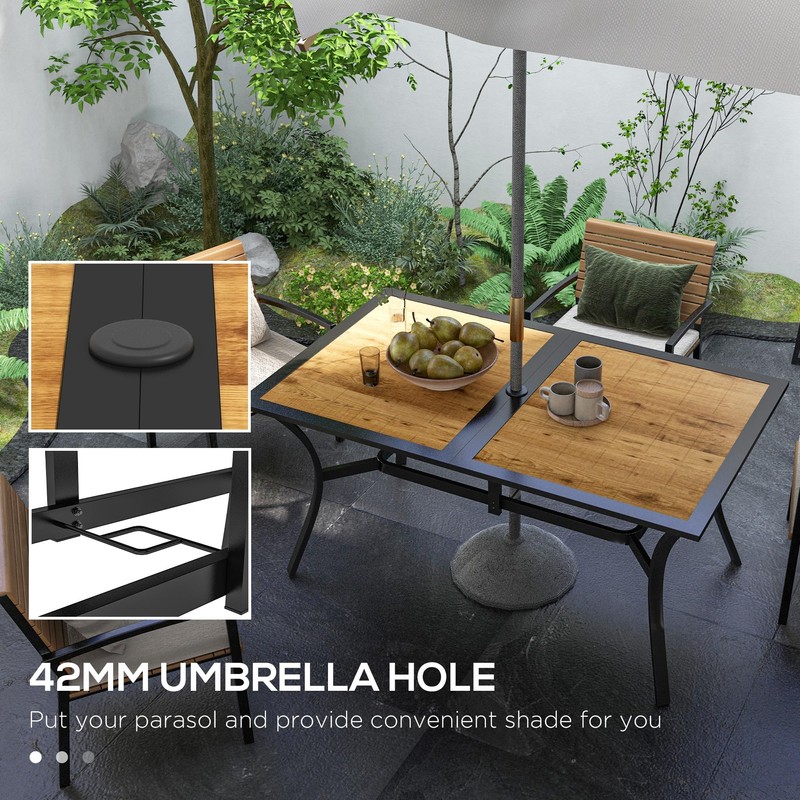 Outsunny Rectangle Outdoor Dining Table for 6 People, Faux Wood Rectangular Patio Table with Umbrella Hole, Steel Frame for Garden, Balcony, Brown