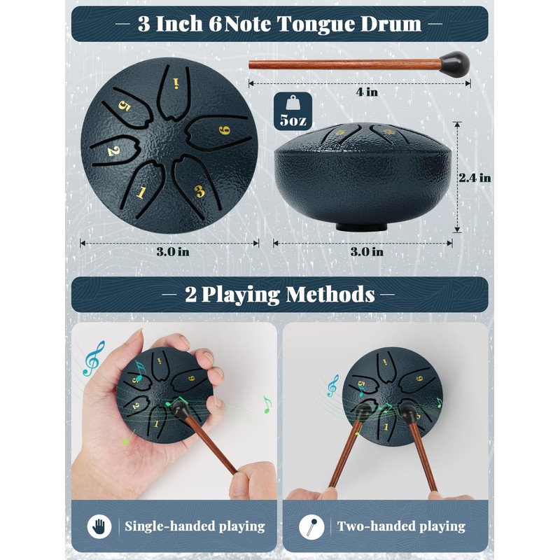 - Perfect for BeginnersWith engraved notes, this drum is easy to play using drumsticks or your hands. Comes with sheet music to help beginners learn effortlessly. Included is a portable bag, making it easy to take your music outdoors. Set includes: 1 steel tongue drum, 1 drum bag, 2 drumsticks, 1 drumstick holder, 1 sheet music, 4 finger pads, and 2 note stickers.