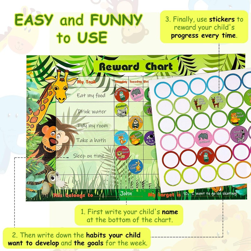 • Sufficient quantity: there are 6 pieces jungle animals reward charts, 6 sheets animal training stickers (360 stickers in total), in this behaviour training reward chart set, altogether 12 pieces, enough amounts to develop children's habits