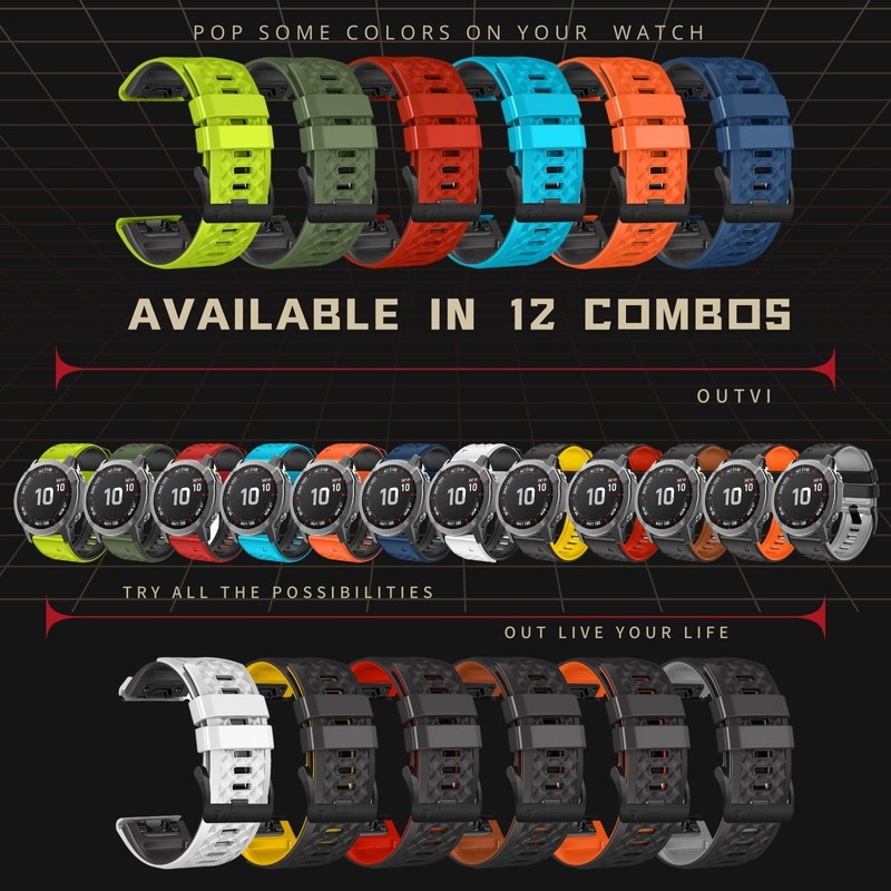 OUTVI 26mm watch band for garmin fenix 5x 6x 7x 3 hr Pro Solar Epix Pro Gen 2 51mm quick fit 26 watch bands rugged silicone Enduro 2 Descent Mk1 Mk2 Mk2i Mk3i tactix dual colors men women WHITE BLACK