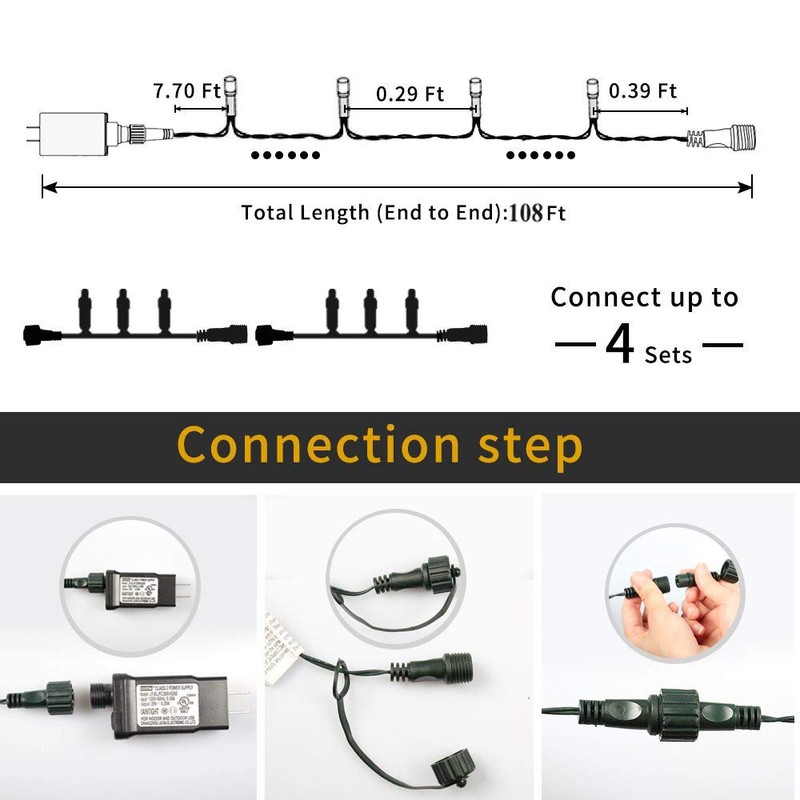 - PERFECT SIZE AND SUPPORT 4 SETS END TO END CONNECTABLE: 300LEDs 108FT And Support Max 4 Sets End to End Connect. Each one length is 108 feet, Freely 1-4 sets conntect according to your demand. the max expandable length is 432 feet., You Can Buy 4 Sets To Connect Together, Enough To Cover Larger Area.