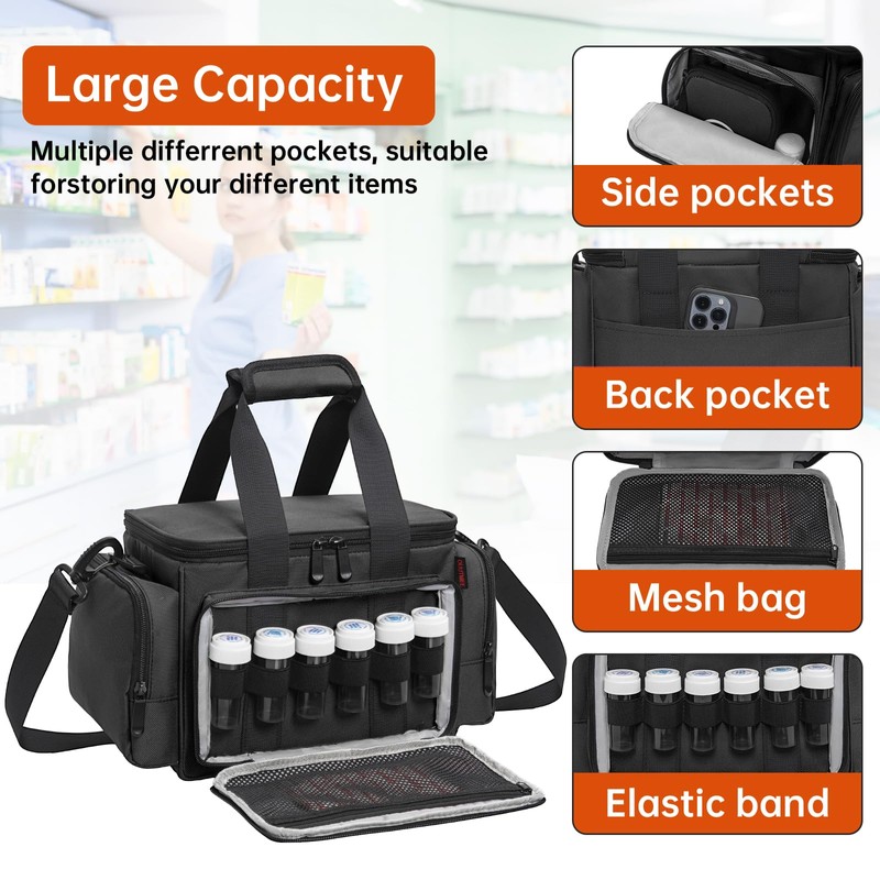 - Large Capacity: Our medicine bag has attachable dividers to store large medicine bottles. A mesh pocket inside for small pill boxes. The front pocket is equipped with multiple elastic bands and a mesh pocket. 2 side pockets store personal belongings