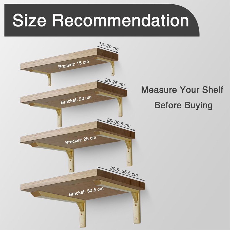 - CONTENT: 4pcs heavy duty shelf bracket (Wooden shelf is not included), 8pcs gold long screw and 8pcs anchor (for wall), 8pcs gold short screw (for shelves).
