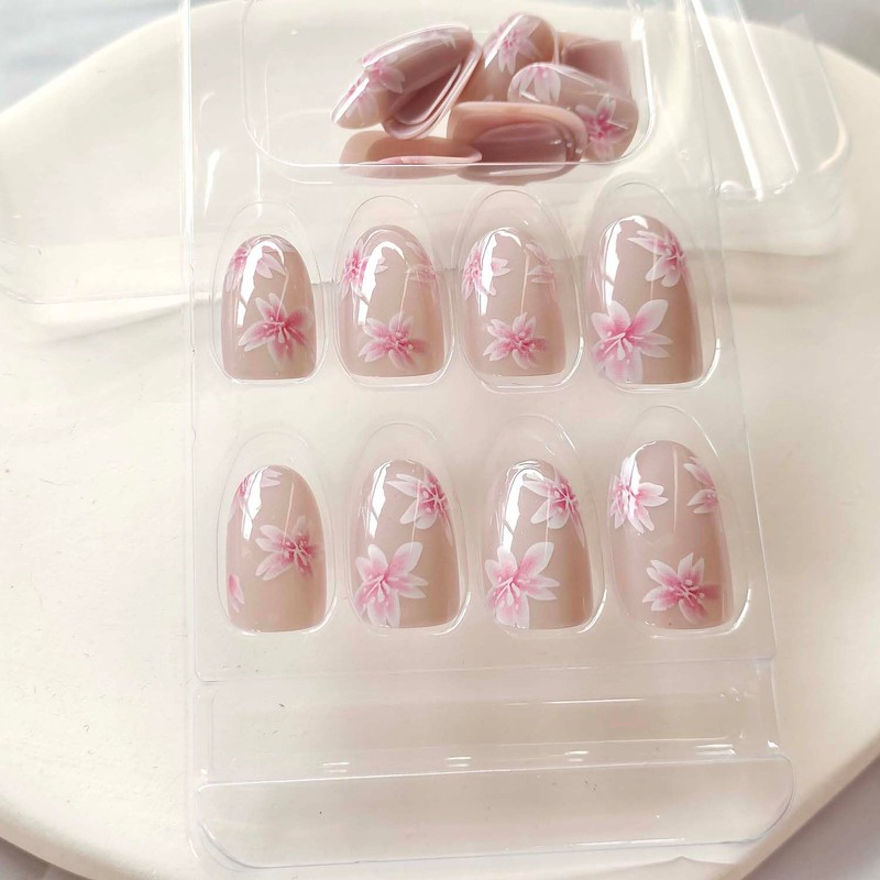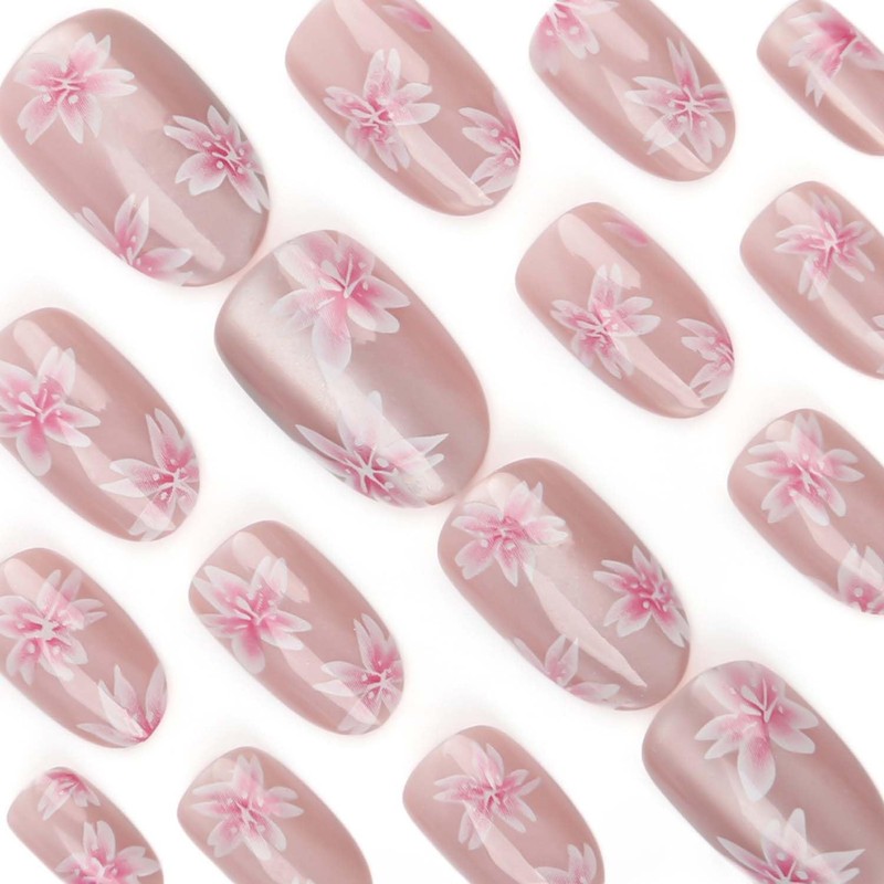 Oval Press on Nails Pink Flower Fake Nails Spring Cherry Blossom False Nails Short Glue on Nails Glossy Acrylic Nails with Five Petal Flower Designs Summer Sparkling Artificial Stick on Nails