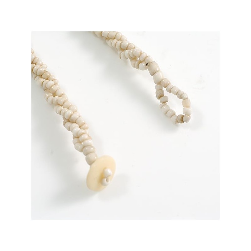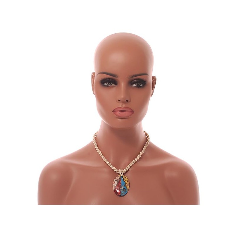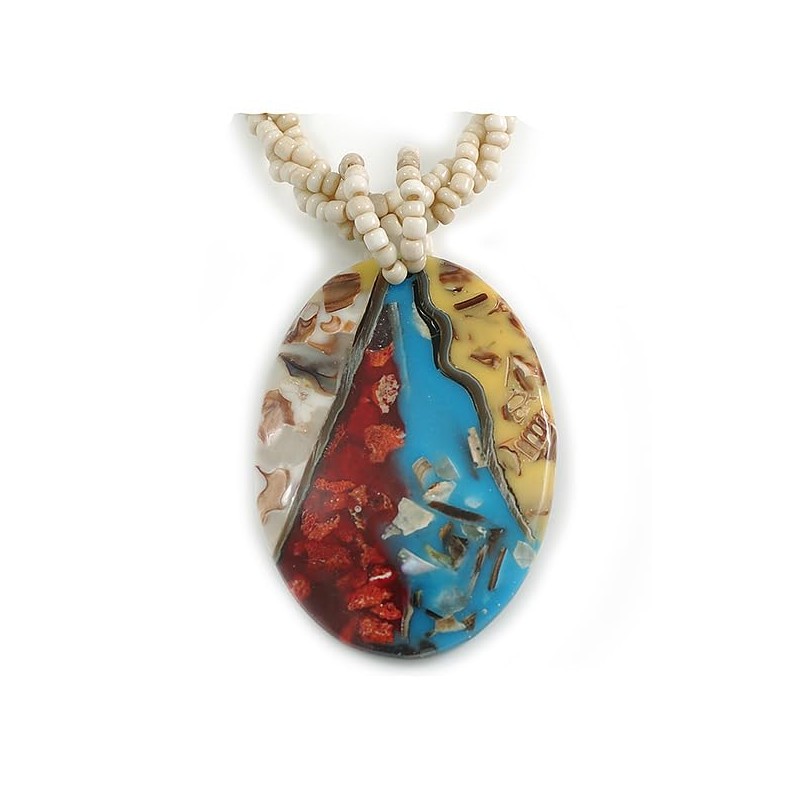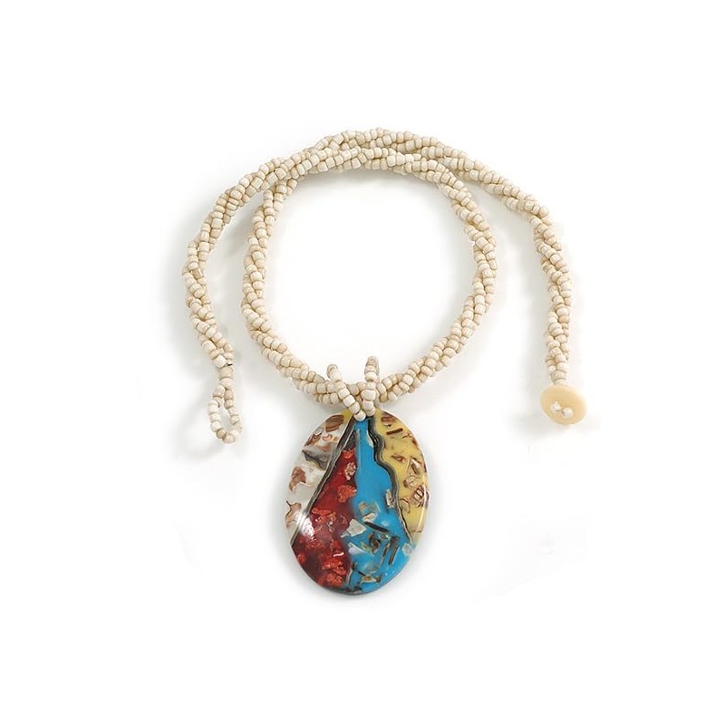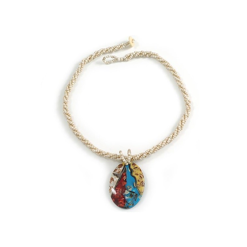 Oval Shell Pendant on Antique White Bead Twisted Cord Necklace in White/Red/Blue/Yellow Colours - 44cm Long