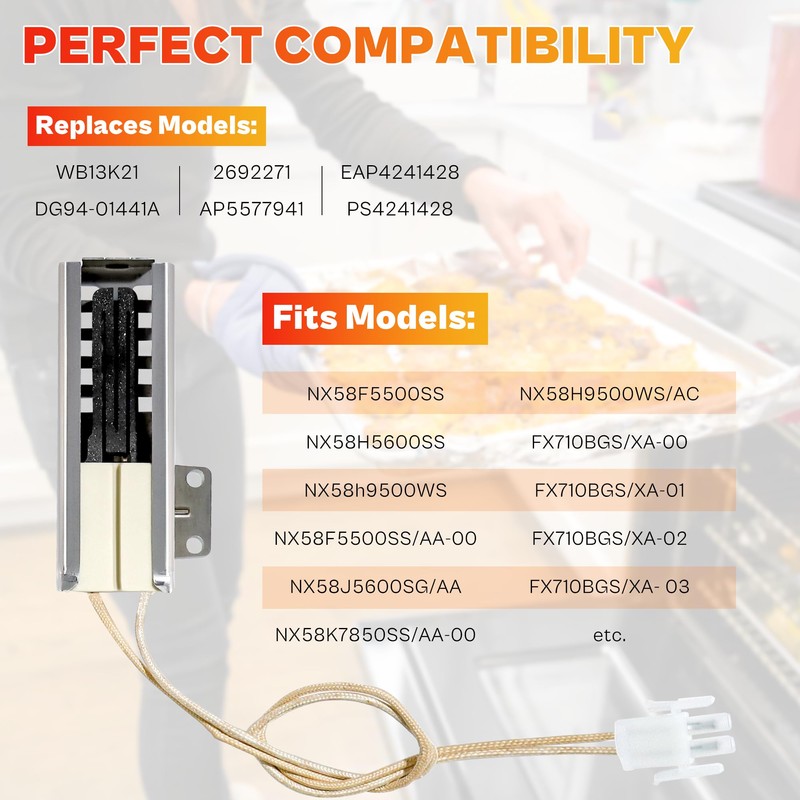 HIGH QUALITY: The sam-sung oven igniter replacement is made of high quality silicon carbide material and can quickly heat up to 2000-2800 degrees Fahrenheit in 1 minute. With this reliable samsung gas oven igniter replacement, you can say goodbye to heating malfunctions, erratic temperatures and gas odors. COMPREHENSIVE KIT: The sam-sung nx58h9500wsaa oven igniter replacement parts kit includes a pair of ceramic wire nuts for seamless splicing, dual brackets, 1 connector plug, and a high-temperature stainless steel shield for added durability. FUNCTIONAL ROLE: sam-sung range oven burner igniter dg94-00520a is used for baking and broiling functions to ensure better heat resistance and extend the life of the oven. sam-sung nx58j5600sg/aa oven igniter The gas stove igniter is a perfect replacement for models WB13K21, DG94-01441A, 2692271, AP5577941, EAP4241428, PS4241428, Norton 501a and more. Fits models NX58F5500SS,NX58H5600SS,NX58h9500WS,NX58F5500SS/AA-00,NX58J5600SG/AA,NX58K7850SS/AA-00,NX58H9500WS/AC,FX710BGS/XA-00,FX710BGS/XA-01,FX710BGS/XA-02, FX710BGS/XA- 03,NX58F5500SS/AA NX58K9500WG/AA,FX710BGS/XA,NX58K9850SS/AA,NX58H5650WS/AA,NX58H9950WS/AA,NX58F5500SB/AA,NX58F5700WS/AA,NX583G0VBSR/AA,NX58J5600SG/AA,NX58J5600SG/AA,NX58K9850SG/AA,NX58M5600SB/AA,NX58M5600SW/AA,NX58M9420SS/AA,NX58H9500WS/AC,NX58M6850SS/AA,NX58M6630SG/AA,NX58R5601SG/AA,NX58R5601SS/AA,NX58R4311SS/AA,NX58T7511SS/AA,NX58R4311SG/AA,NX58R6631SS/AA,NX58R6631SG/AA,etc EASY INSTALLATION: The sam-sung nx58r5601ss/aa gas oven igniter is very easy to install and will have your oven back to life in less than 20 minutes. All you need are basic tools such as a screwdriver and a small adjustable wrench. Remember to unplug the gas oven igniter and wear protective gloves during the installation of the sam-sung oven igniter replacement to ensure safety.