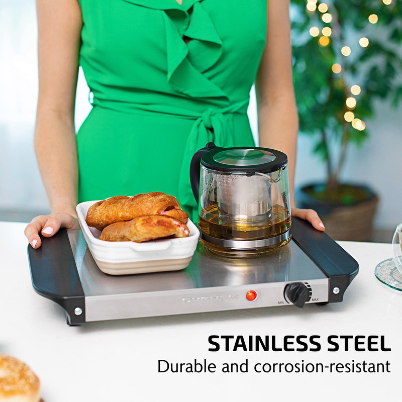 - KEEPS THE FOOD WARM WITHOUT BURNING – The warming tray is powered by a 150W heating element that keeps the food hot without drying out or burning the bottom. You can also use the tray as a standalone warmer and you can place dishes in heat-resistant glass ceramic or metal kitchenware.