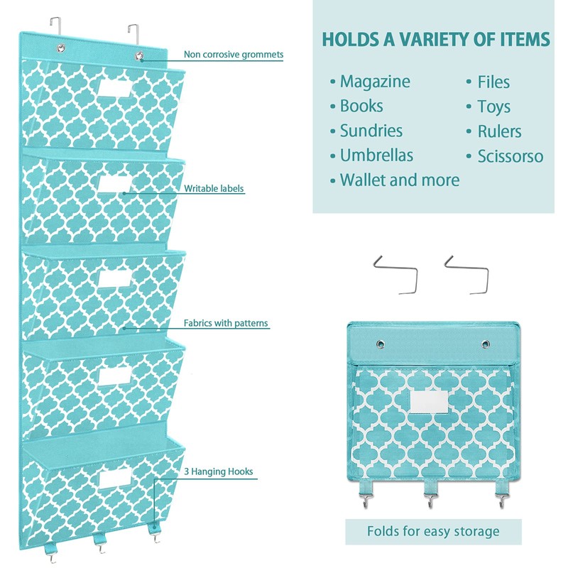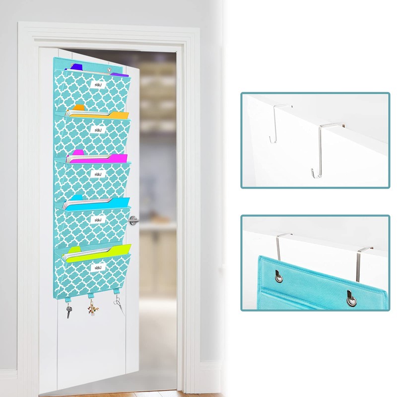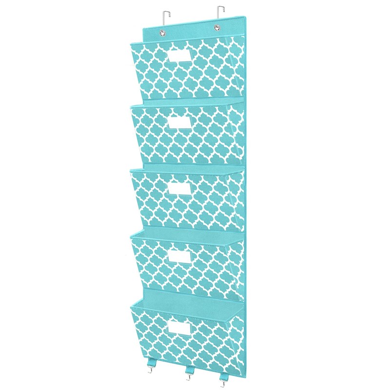 Over The Door File Organizer, Hanging Wall Mounted Storage Holder Pocket Chart for Magazine, Notebooks, Planners, Mails, 5 Extra Large Pockets(Blue withLantern Pattern)
