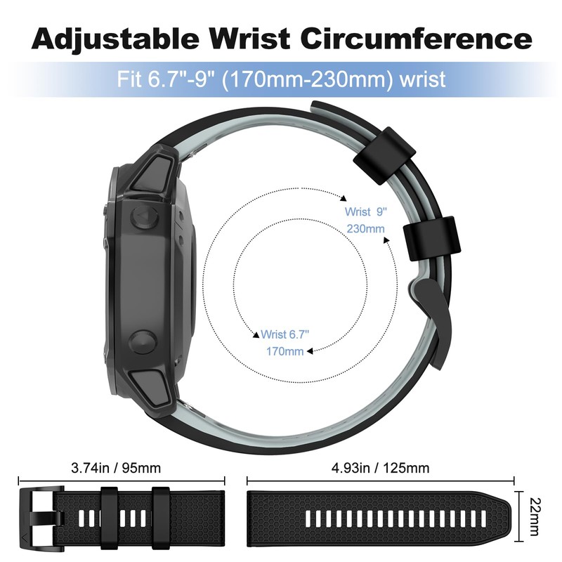 • For Garmin Watch Silicone Band: Compatible with Garmin Watch 22mm ALL Models, including: Fenix 7 / Fenix 6 / Fenix 6 Pro / Fenix 5 / Fenix 5 Plus / EPIX / Forerunner 935 / Forerunner 945 / Approach S60 / Approach S62 / Quick 5 / Quick 6 / MARQ, Adjustable to fit a wrist size of 6.69''-9.05''(170mm—230mm), You can achieve the perfect fit for your small or large wrist.