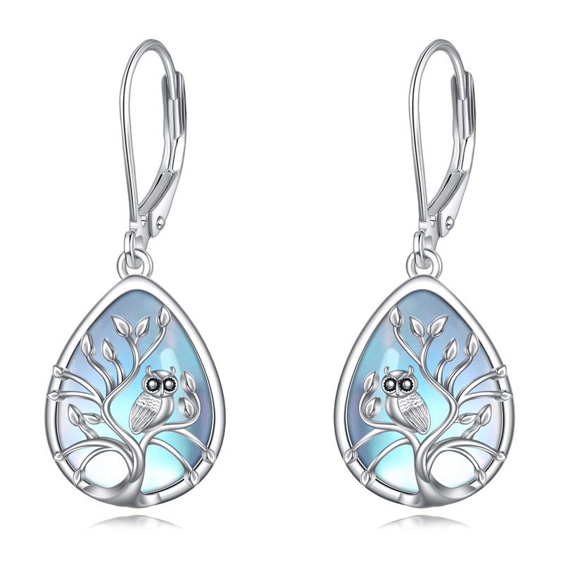 Owl Dangle Drop Earrings 925 Sterling Silver Tree of Life Leverback Earrings Moonstone Jewelry Gifts for Women