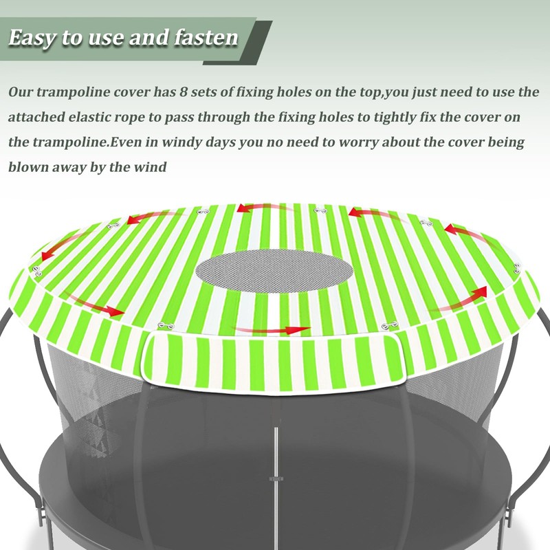 - Easy to use and fasten:Our trampoline cover has 8 sets of fixing holes on the top,you just need to use the attached elastic rope to pass through the fixing holes to tightly fix the cover on the trampoline.Even in windy days you no need to worry about the cover being blown away by the wind