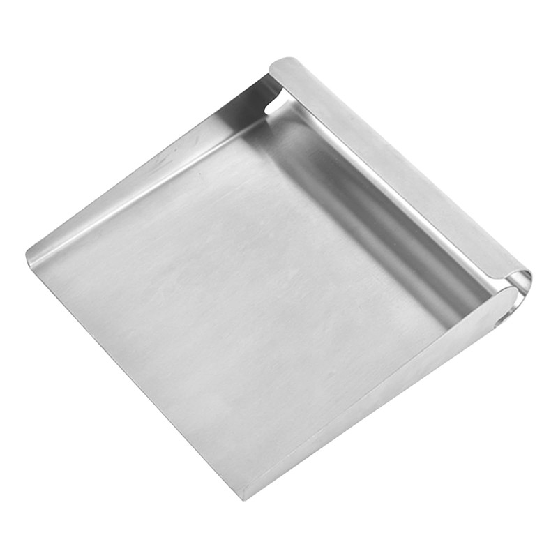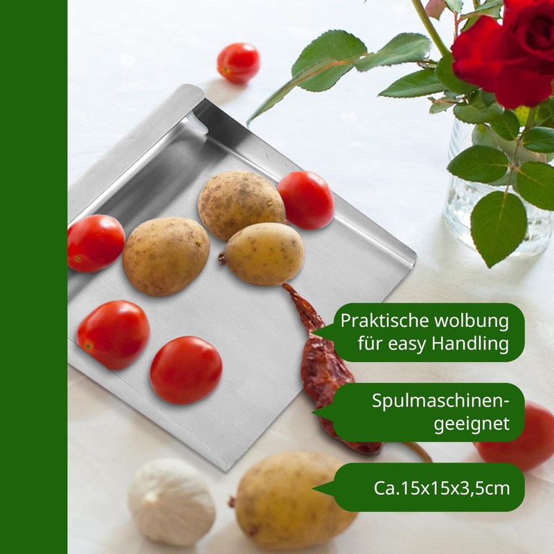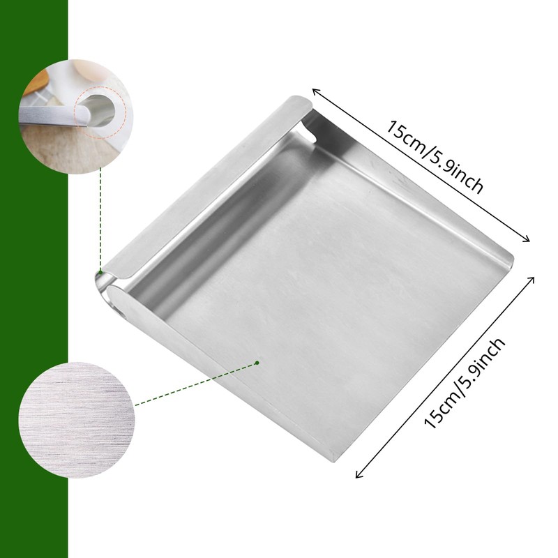 - Box contents: 1 x kitchen scraper made of high-quality stainless steel, with raised edges, approx. 15 x 15 x 3.5 cm.