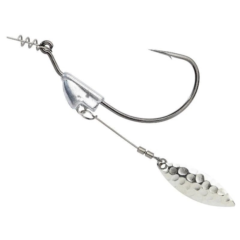 The Owner Flashy Swimmer Single Bass Hooks with CPS 2-Pack are great for rigging soft plastic swimbaits and flukes thanks to their spinner blades that are attached to nonmoveable weights that keel a rigged soft plastic bait for use as a search bait.