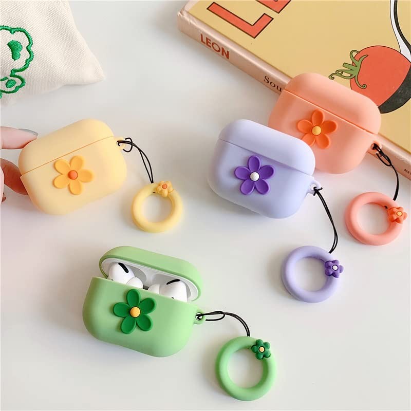 Ownest Compatible for AirPods Case Cute Cartoon Flower Pattern Girls Woman Soft Silicone Shockproof Keychain Design Cover for Airpods Pro-Green
