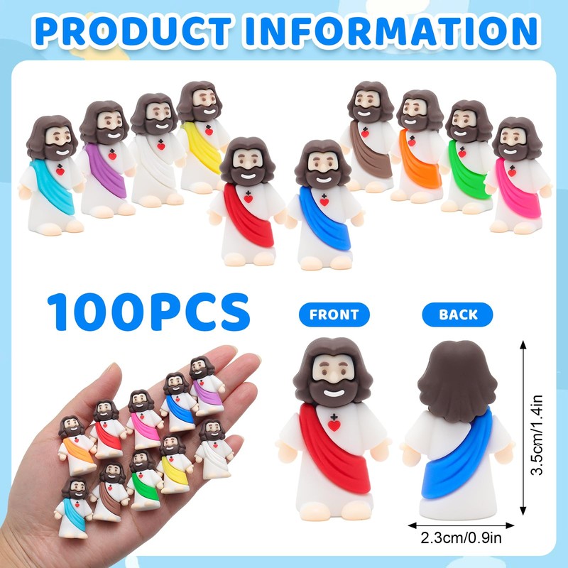 - Enough Colors and Styles: You will receive 100 pack mini jesus figures with 10 colors, contains red, cyne blue, shineblue, green, gold, purple, white, pink, brown, orange. Each figures measures about 1.2x1.4 inches/ 3x3.5 cm in size. Available in sufficient quantities to meet your usage and replacement needs, you could share with your friends to show care and kindness.