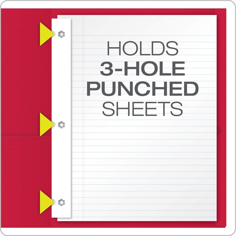 Oxford Twin Pocket Folders store up to 135 sheets of letter-sized paper. The built-in, 2-prong metal fasteners prevent important papers from falling out. Textured red covers. Die-cut business card holder on inside pocket. Paper made from 10% recycled fiber with 10% post consumer fiber. Letter size. 25 per box.
