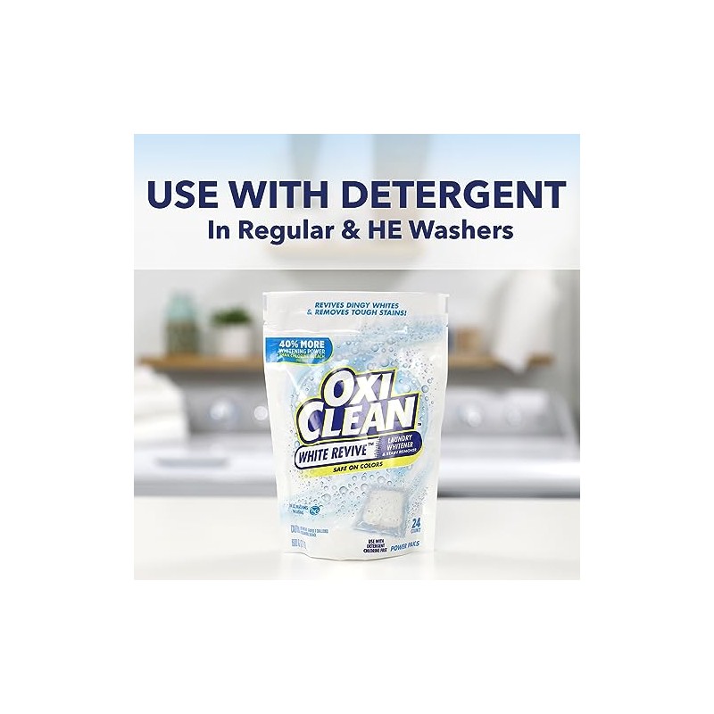 Revive dingy whites and remove tough stains with OxiClean White Revive Laundry Whitener and Stain Remover Power Paks. This laundry detergent booster whitens whites 40 percent better than chlorine bleach per load without the risk of chlorine spills and splatters. When used as directed, this oxygen-based, water-activated, color-safe stain remover for white clothes removes stains, and brightens and revives machine-washable white clothes, canvas shoes, sheets, t-shirts and more, all without the harsh smell of bleach. Ideal for HE and standard washing machines, these clothes whitener laundry paks work with your regular laundry detergent as a chlorine bleach alternative to revive brilliant whites. Power Paks are mess-free and require no measuring—just drop a pak into the drum, add detergent, and then add clothes. This 24 count pouch has enough fabric whitener laundry booster Power Paks for many laundry loads, so you can wear white fearlessly. From stain removers and laundry boosters to household cleaners and much more, OxiClean offers a product to fit your needs.