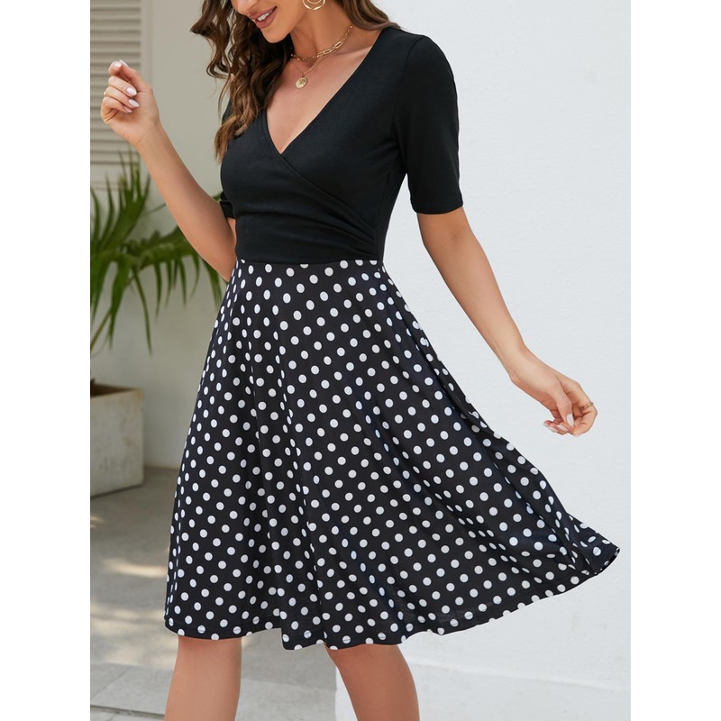 oxiuly Women's Chic Criss-Cross V-Neck Half Sleeve Polka Dot Cotton Stretchy Casual Swing Midi Summer Dress OX233 (XL, BK-dot 5)