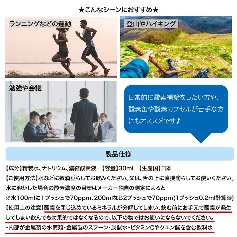 - 【✅そのままでも◎】飲料に混ぜるだけでなく、そのまま直接リキッドを舌の上に垂らしての摂取も可能です。コップや飲料がない時でも、これだけでサッと酸素補給ができちゃいます♪