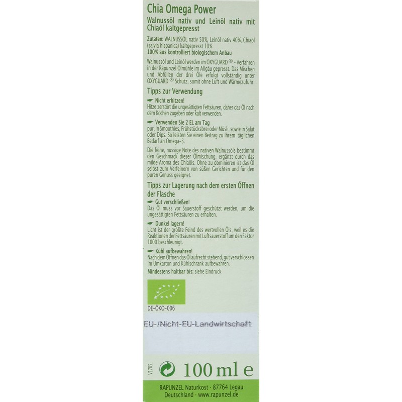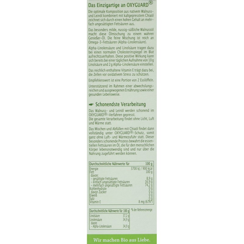 - The walnut and linseed oil are gently pressed in the OXYGUARD process. The entire processing from opening the bowl to pressing and filling takes place without light, air and heat