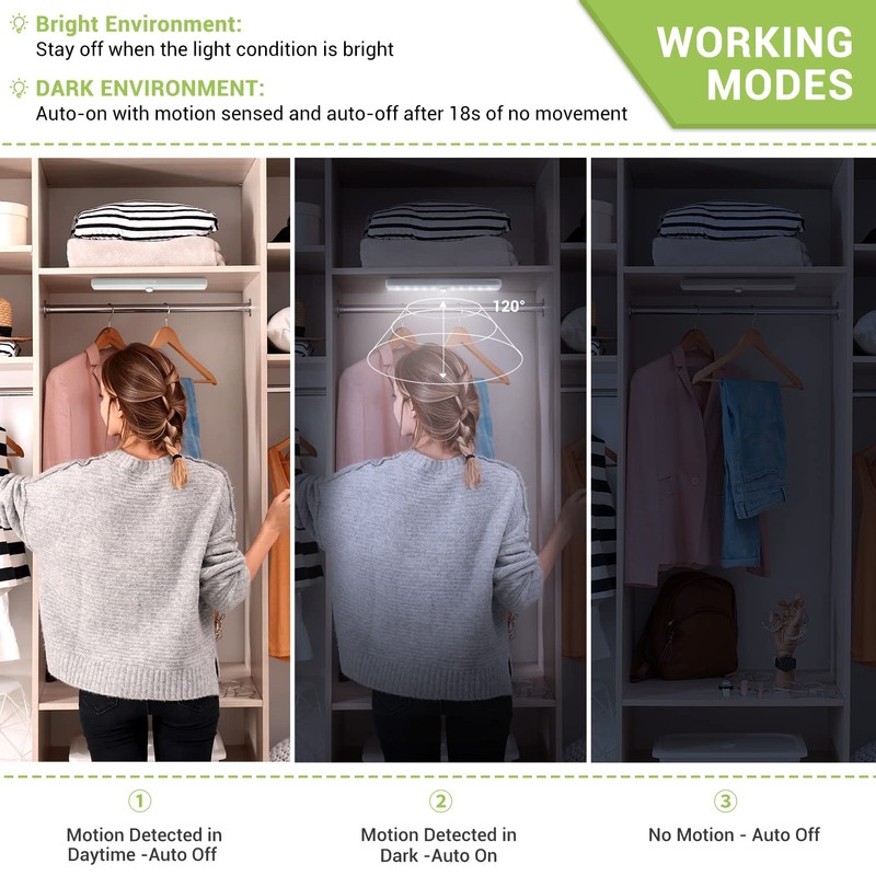 • BATTERY OPERATED: Each under cupboard kitchen lights is Powered by 4PCS AAA batteries (not included, Tip: Please use safe and reliable batteries to prevent light damage due to the battery leaks. Warm prompt: 1. The wardrobe lights motion sensor won't turn on if the light sensor has been detected by enough light. 2. Never install the light near the place