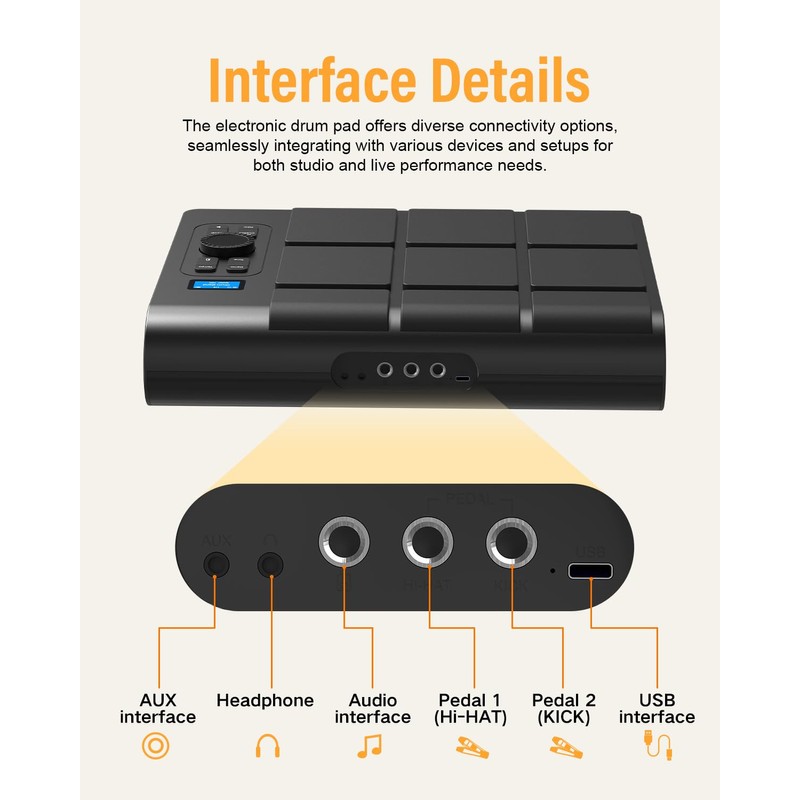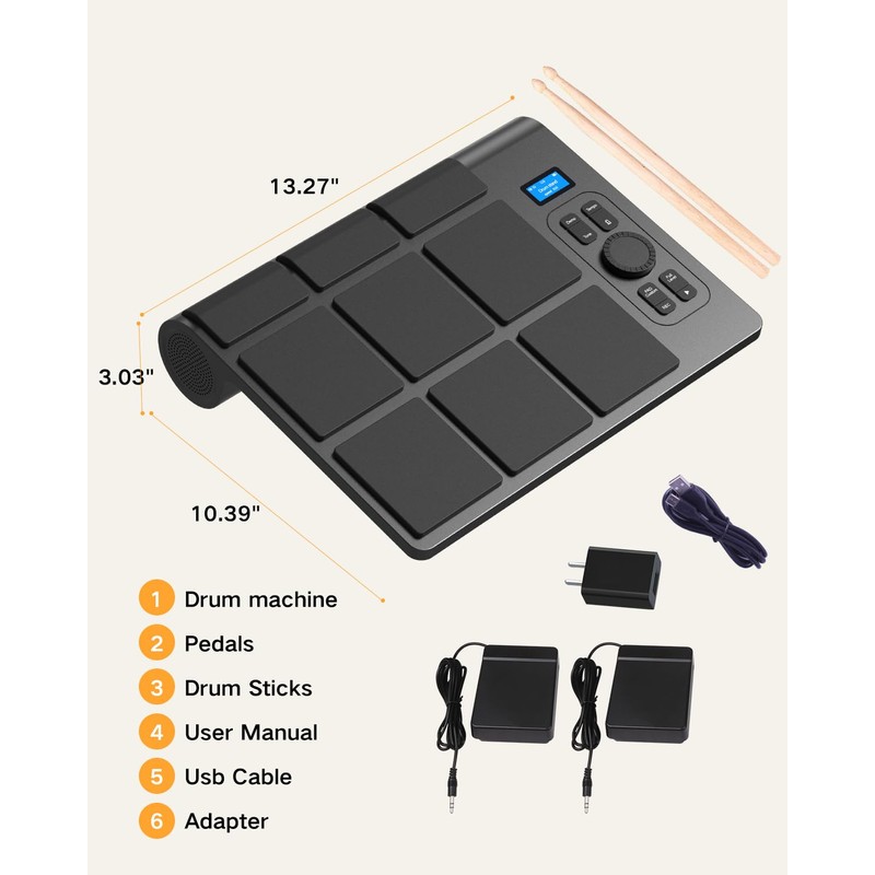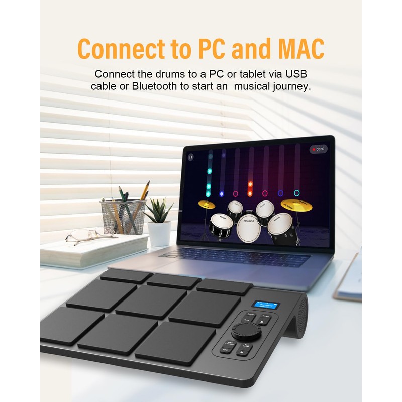 - 【Edit & Record 】 The Digital drum pad top panel control center comes equipped with an LCD screen and a ton of audio configuration controls that will allow you to create some truly unique and customizable music.