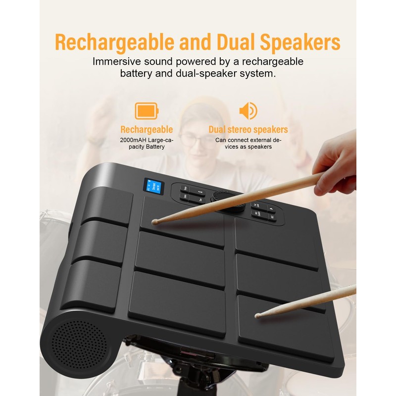 - 【Portable and Long Battery Life 】The portable electronic drum kits is powered by the included adaptor. The capacity of the rechargeable battery is 2000 mAh. Enough to meet your portable needs and enjoy music anytime, anywhere