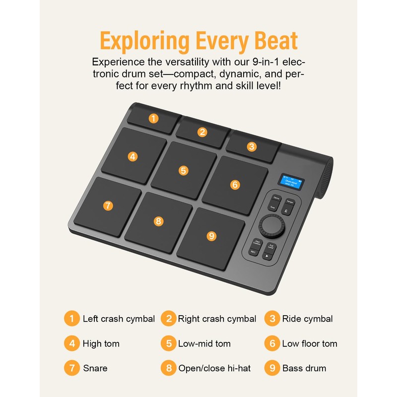 - 【Versatile Digital Drum Kit 】The 9-in-1 Portable Electronic Drum Kit featuring a full range of beats with 2 pedals and 9 different drum pads including left/right crash cymbal, ride cymbal, open/close hi-hat, snare, high tom, low-mid tom, low floor tom, bass drum