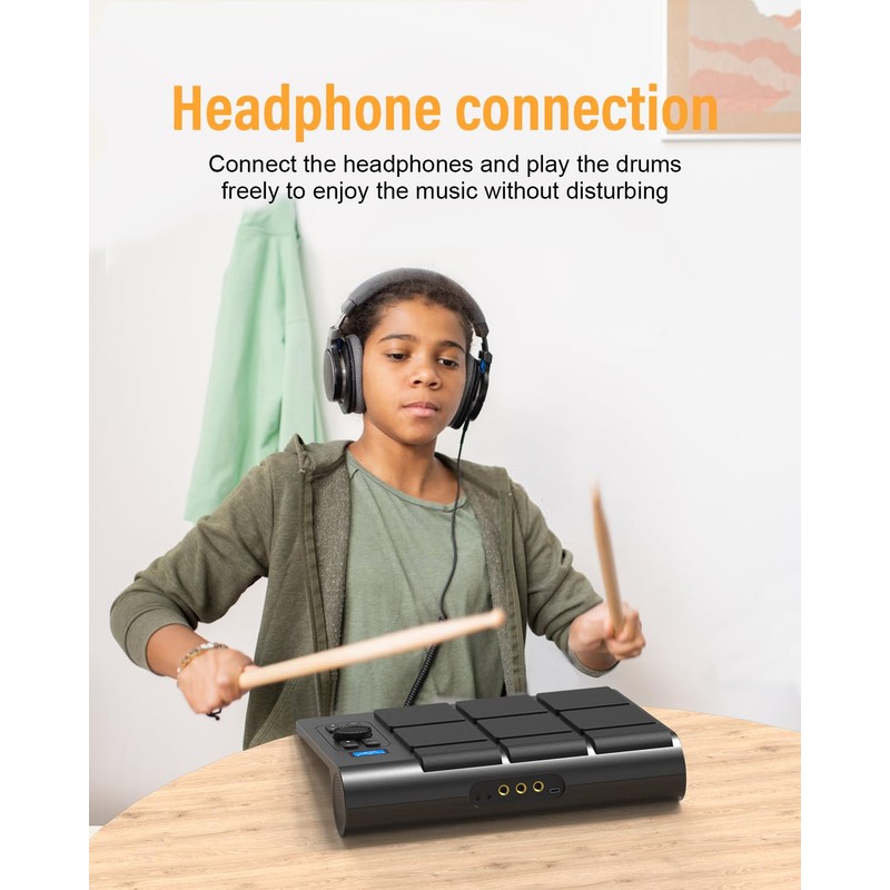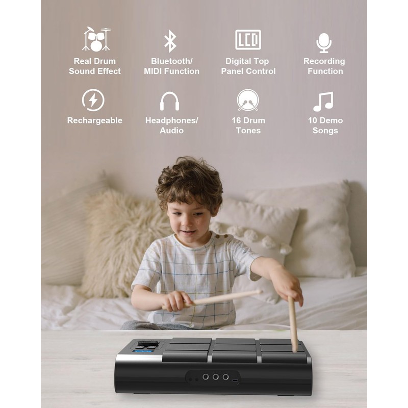 - 【Rich Function 】: You can practice at night with headphones to minimize disturbances. The Electronic Drum Pad features 10 demo songs and 16 real drum tones. It also includes touch sensitivity, MIDI functionality, and drum pad lights. As a professional, you can easily create songs with imagination and diversity.