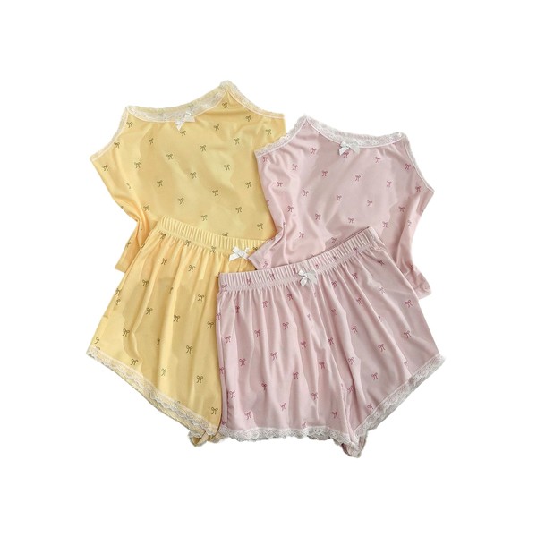 - Features: Summer pajama set, bow graphic print, lace trim, scoop neck cami top, elastic waist shorts, 4 piece set