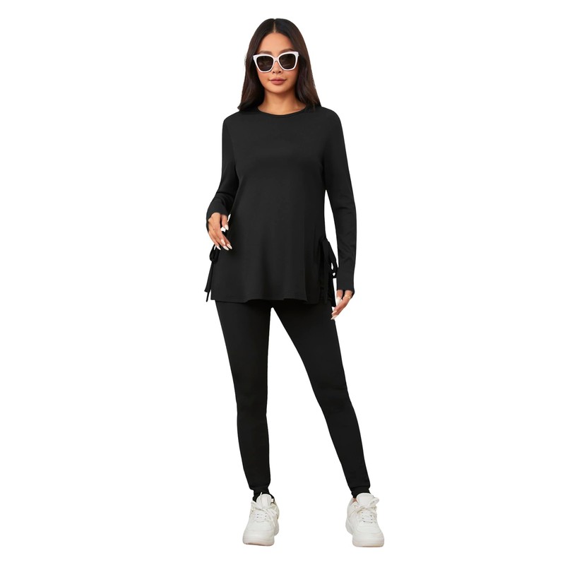 OYOANGLE Women's Maternity Rib Knit Round Neck Knot Side Tee Tops and Leggings Pants Sets Black Iris Large