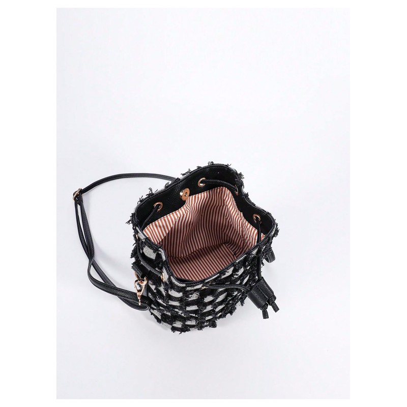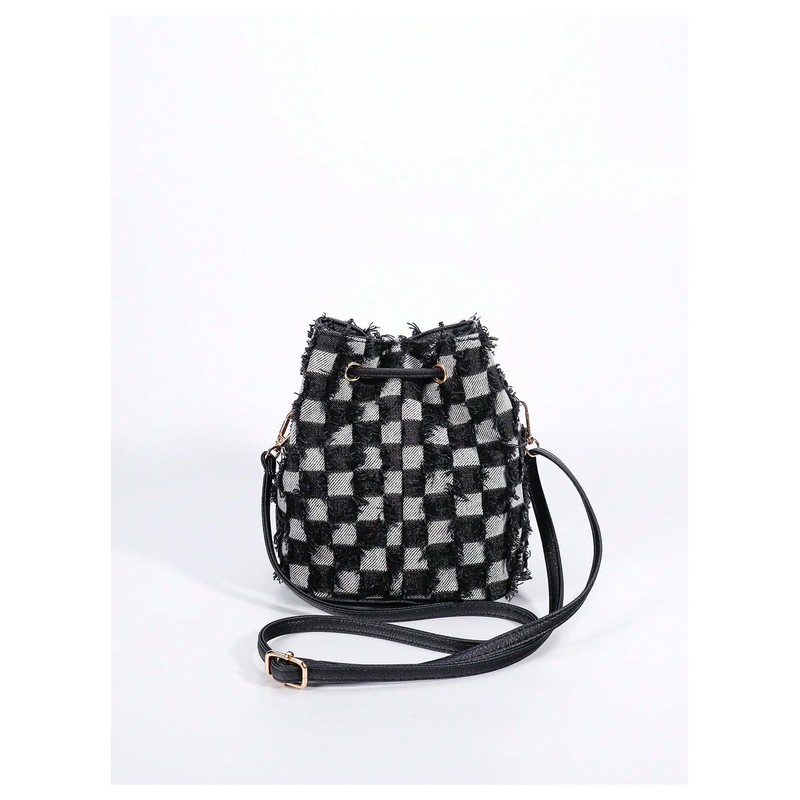 OYOANGLE Women's Plaid Print Drawstring Raw Trim Crossbody Bags Casual Mini Handbags Clutch Purses, Black White, One Size