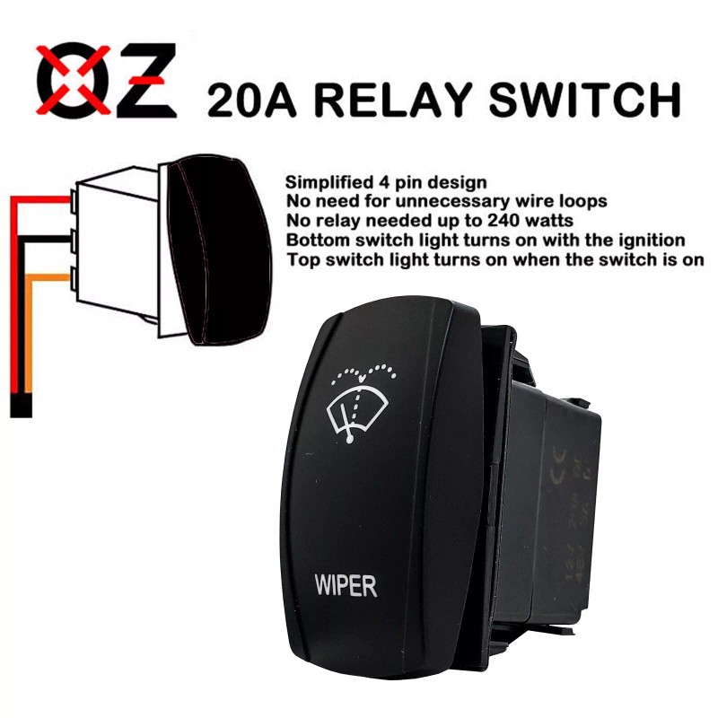 - Wiper laser-etched ON/OFF/ON Rocker switch. Windshield washer is a momentary ON switch. Blue LED backlit. 20 Amp 12-Volt 4-PIN.