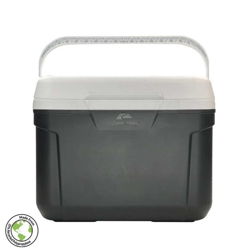 Start your adventure outdoors off right with the Ozark Trail 30 Quart hard-side polypropylene cooler. This Gray 30 QT cooler is perfect for packing a lunch or snack for enjoying the outdoors or a sports event. With interior insulation your snacks and beverages will stay cool until you're ready to enjoy. This cooler features a 28-Liter storage capacity that holds up to 42 (12-oz) cans. Raised feet on the bottom of the cooler keep it from laying flat on the ground and a sturdy handle lets you carry it with ease. Keep your beverages close by with the molded cup holders on the lid of the cooler. This Ozark Trail 30-quart cooler is made with a minimum of 25% post-consumer recycled plastic.