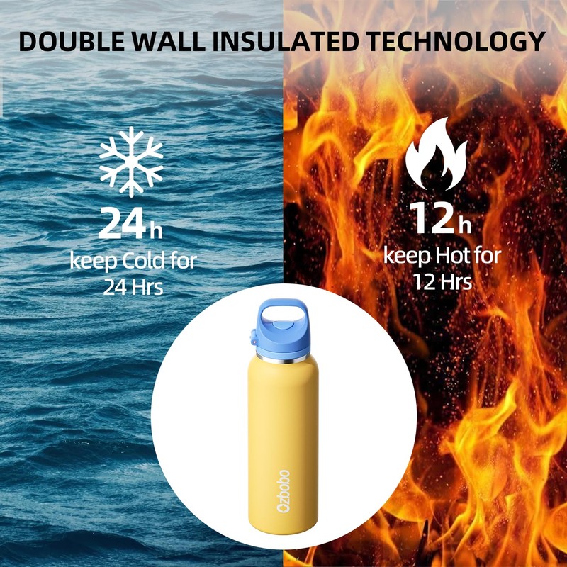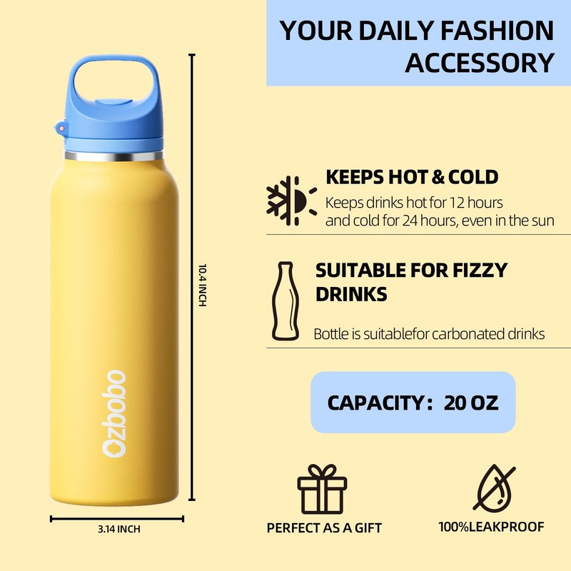 Ozbobo 20 OZ Water bottle with Quick Fill Technology, Double Walled Vacuum Insulated Bottle For Women Man, 100% Leak Proof Locking Lid, Sip & Chug, BPA Free, Holiday Gift for Him Her(Yellow)