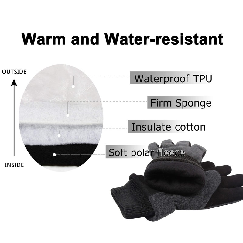 - Ready Wind and Water Resistant Gloves for Winter Outdoor Sports: These gloves with inserted wind and water-resistant and breathable TPU between polar fleece and headlock insulated material in the back, keep warm in drizzle without hurting your hands