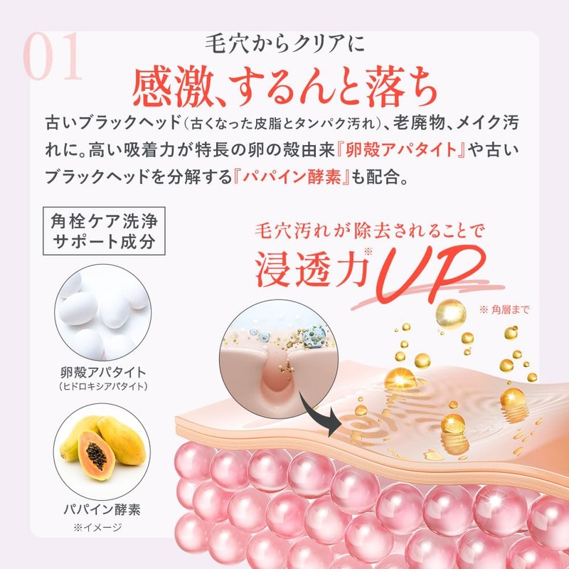 - 【酵素や卵殻アパタイトが澄み渡るような明るい肌をサポート】 洗顔だけでは落ちにくい、たんぱく汚れを分解する「パパイン酵素」に加え、卵の殻由来の「卵殻アパタイト」を配合※1。高い吸着力で古い角質や角栓を取り除くのをサポート。むき卵のようなつるんとした透明美肌※2に。みずみずしい柑橘系の香りで、あらうたび心地よいひとときを。 ※1 洗浄サポート成分として配合 ※2 汚れや古い角質を落として肌を明るくすること