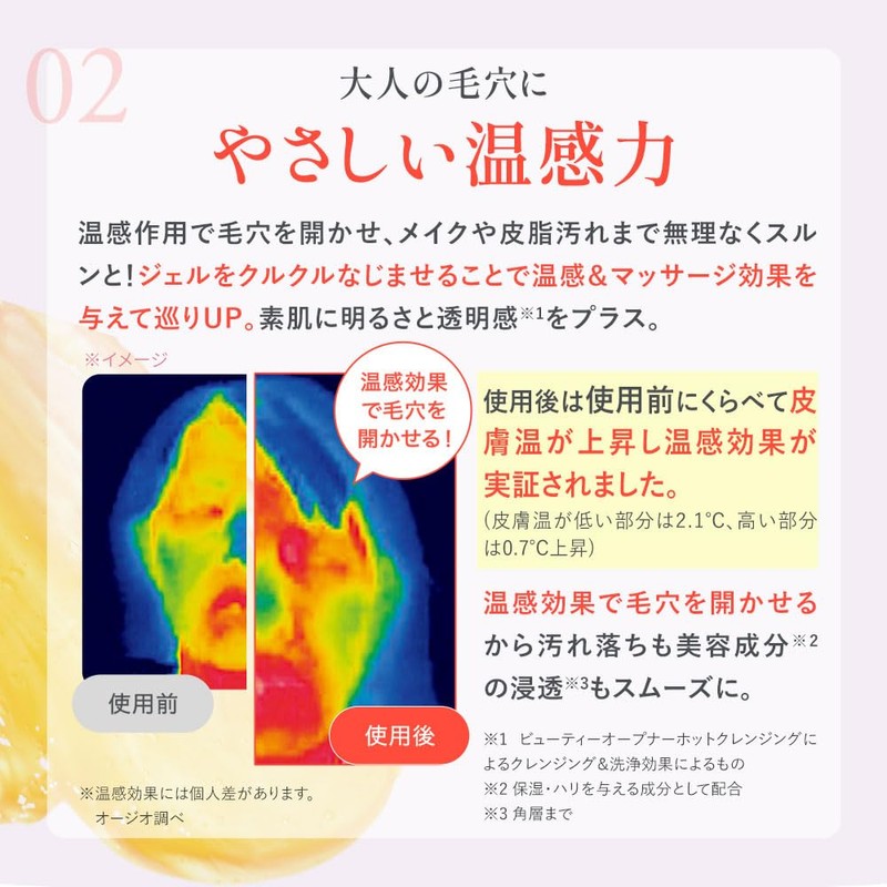 - 【寒さでこわばった肌の温感めぐりケア&汚れをオフ】 肌を温めることで毛穴が開きやすくなり、お手入れがスムーズに。マッサージをするようになじませ、顔全体を温めることで、古い角質など取り除きやすい環境に整えます。