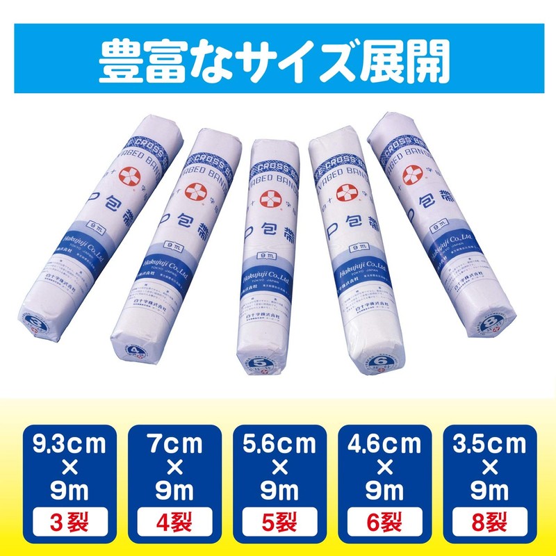 白十字 P反巻 (耳付きホータイ) 4裂 7cm×9m 天然繊維使用 非伸縮包帯