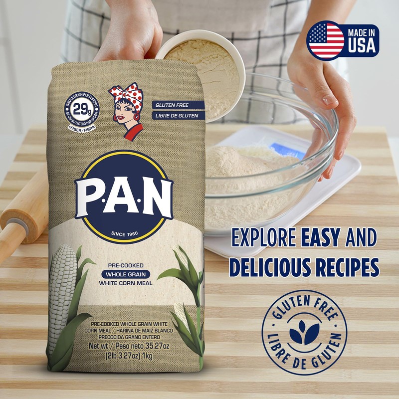 - EASY TO PREPARE – Our white corn meal is pre-cooked, meaning your delicious meals will take less time to be ready! Just by adding water, P.A.N. whole grain makes instant corn dough, creating a variety of delicious corn based dishes. It can be cooked on a cast iron pan, grill, arepa maker, budare, arepa toaster, griddle or oven!