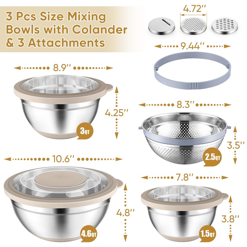 P&P CHEF Mixing Bowls with Lids Set of 3, 3 Pcs Stainless Steel Nesting Salad Bowls and Colander for Kitchen, 3 Grater Attachments & Non-Slip Bottoms, Visible & Airtight Lid, Khaki