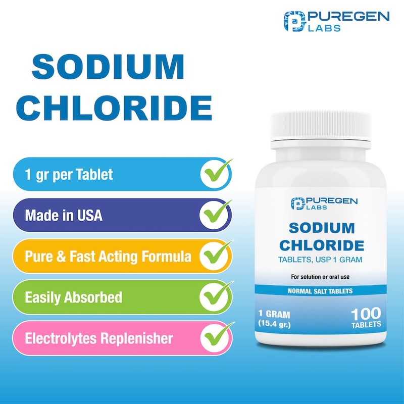 - Fast Acting: Puregen Labs Sodium Chloride (Normal Salt) tablets work quickly to combat or prevent sodium depletion.